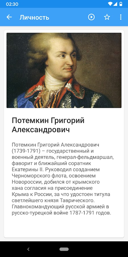 Приложение История России предназначено для помощи в изучении отечественной истории всем желающим. Приложение не имеет цель заменить учителя, репетитора или учебник по истории, а представляет сведения об исторических событиях и личностях в удобном формате, а также предлагает дополнительные инструменты для изучения и закрепления знаний, в том числе карточки, тесты с оценкой выполнения, статистика прогресса изучения, поиск информации в приложении. Приложение может помочь подготовиться к контрольным, тестовым работам, экзаменам, а также пригодится в подготовке к ЕГЭ или ОГЭ по истории.