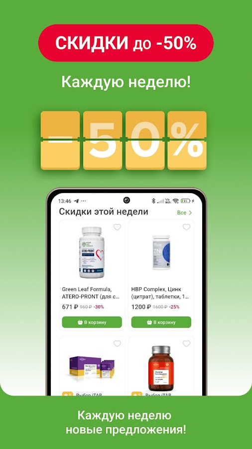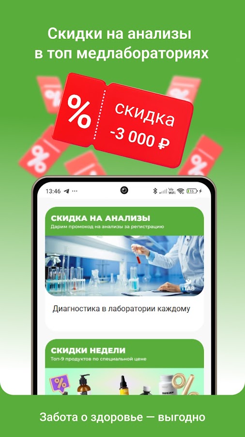 — Лучшие предложения – скидки в известные медицинские лаборатории, а также скидки на первый заказ и товар недели до 50%.