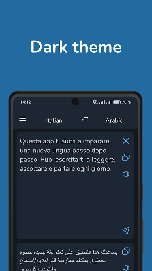 Итальянско-арабский переводчик — быстро, конфиденциально, офлайн. Теперь с темным режимом!