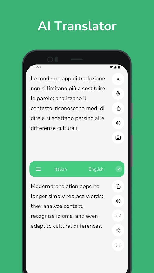 Если вы хотите улучшить свои языковые навыки, общаться с друзьями или исследовать новые направления, наш итальянско-английский и англо-итальянский переводчик станет вашим лучшим языковым компаньоном. Откройте для себя будущее перевода с помощью передовых функций, таких как распознавание текста по фотографиям и обучение искусственному интеллекту в режиме реального времени.