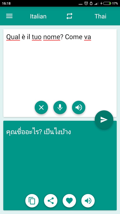 Это бесплатный переводчик может быстро перевести с итальянского на тайском и тайской итальянской (Italiano-тайский переводчик, ไทย อิตาเลียน แปล) слова, а также полные предложения. Мгновенный перевод и полный действия из слов.