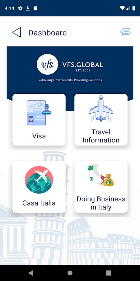 VFS Global давно сотрудничает с Италией, предоставляя визовые услуги для Италии с 2004 года, с 85 центрами, работающими в 35 странах.