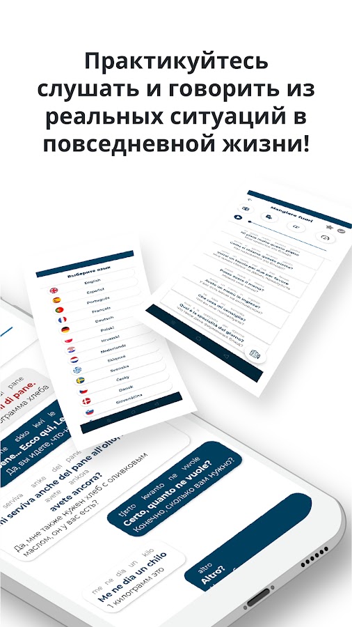 «Учить Итальянский язык — Слушать и Говорить» одно из развивающихся приложений PORO для самообучающихся, желающих легко и эффективно общаться на итальянском языке. 115 повседневных диалогов, список уроков с различной тематикой от приветствия, совершения покупок, работы, семейного разговора и т.д. Подходит для всех изучающих итальянский язык − от начинающего до среднего и продвинутого уровней, для практики общения на итальянском языке.