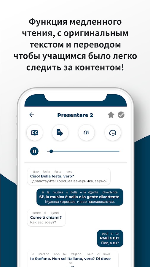 Наслаждайтесь практикой итальянского даже во время вождения или путешествий. Просто откройте приложение и включите режим плейлиста.