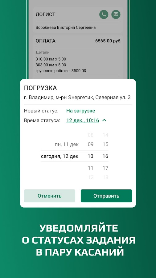 Позволяет работать со статусами точек маршрута перевозки в одно касание.