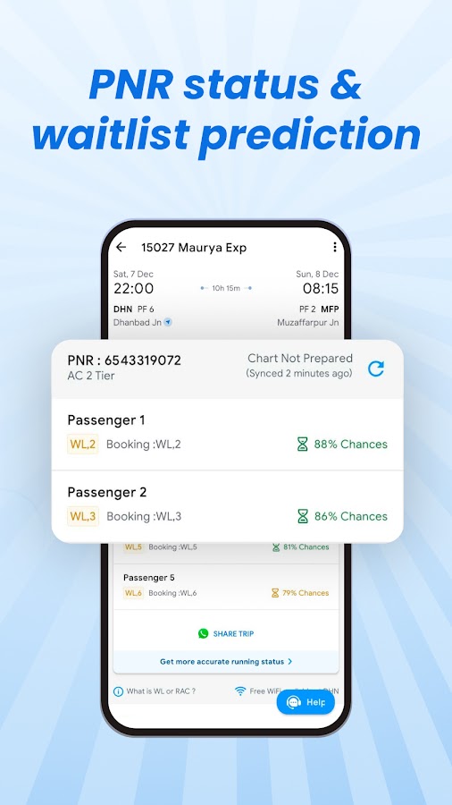 ● Альтернативные варианты для вашего маршрута поезда✅ Статус PNR и прогнозирование в списке ожидания ● Проверьте статус PNR, чтобы узнать, подтверждено ли ваше место на Indian Railways
