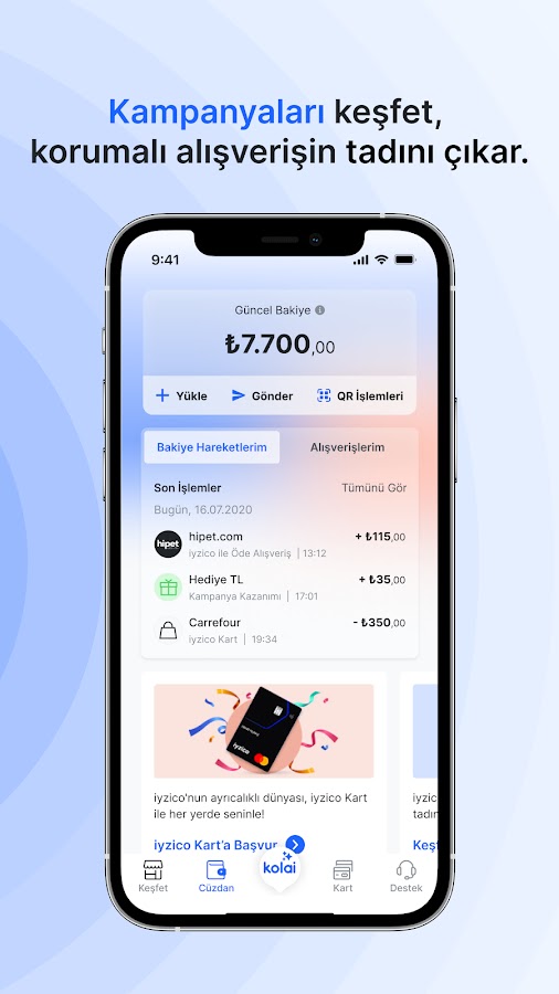 Все привилегии iyzico, которые вы получаете при совершении покупок в Интернете, теперь с вашей картой iyzico всегда с вами! С картой iyzico вы контролируете все свои расходы в магазинах и ресторанах. С вашей картой iyzico теперь легко загружать и снимать деньги во всех банкоматах на свой баланс iyzico, тратить столько, сколько вы пополняете, и получать круглосуточную поддержку в режиме реального времени с гарантией iyzico Protected Shopping!