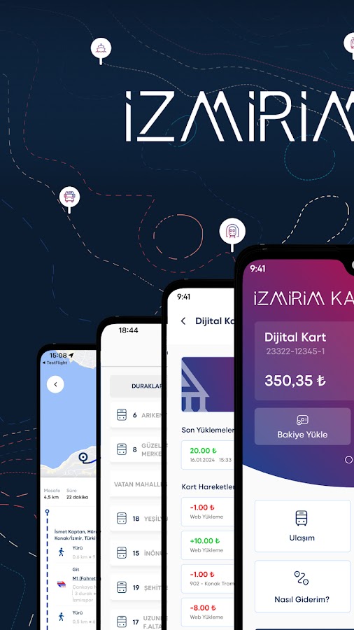 Управляйте общественным транспортом Измира в одном приложении: создайте цифровую карту İzmirim Kart, садитесь в транспорт с помощью QR-кода, просматривайте и пополняйте баланс, а также мгновенно получайте доступ к информации об остановках, поездках и маршрутах.