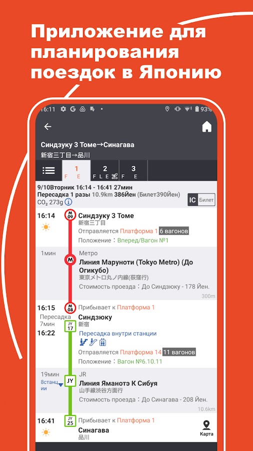 · Поиск маршрута после рассмотрения рейса Японской железной дороги и Билета метро Токио