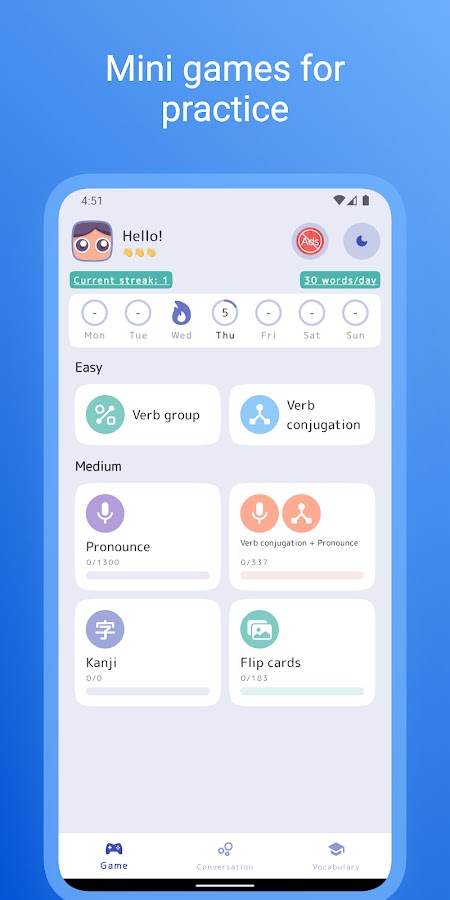 👍 Спряжение глаголов: Проверка и повторение спряжения глаголов на основе стандартной учебной программы, помогая вам улучшить навыки разговорной речи при использовании японского языка.
