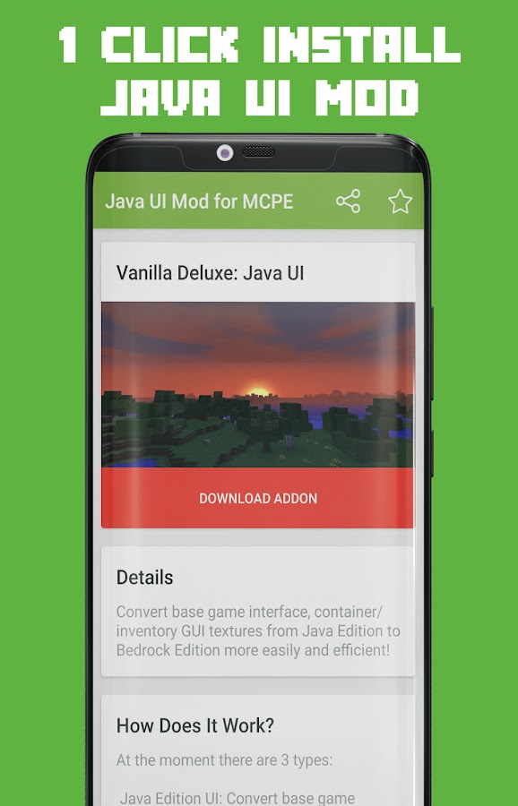 Java UI Mod для Minecraft PE — это приложение, позволяющее легко загрузить и установить Vanilla Deluxe: Java UI + Mixed UI + PvP UI Add-on для игры Minecraft Pocket Edition на ваших устройствах Android. Благодаря нашему установщику в один клик, который упрощает установку модов, дополнений, карт, скинов и пакетов текстур Minecraft.