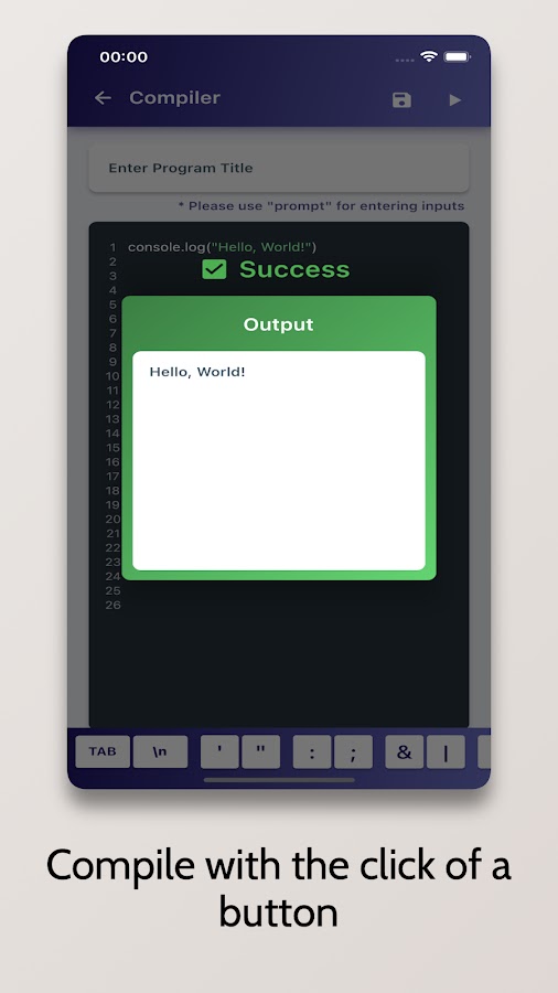 Компилятор JavaScript — это расширенная среда разработки, позволяющая бесплатно компилировать программы JavaScript на вашем мобильном телефоне. Он поставляется с редактором кода со встроенными возможностями подсветки синтаксиса.