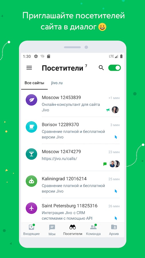 Быть всегда на связи с клиентами — залог процветающего бизнеса. Jivo поможет с этим. С помощью приложения для Android моментально отвечайте на обращения из чата на сайте, мессенджеров и социальных сетей. Не упустите ни одного клиента, где бы вы ни были.