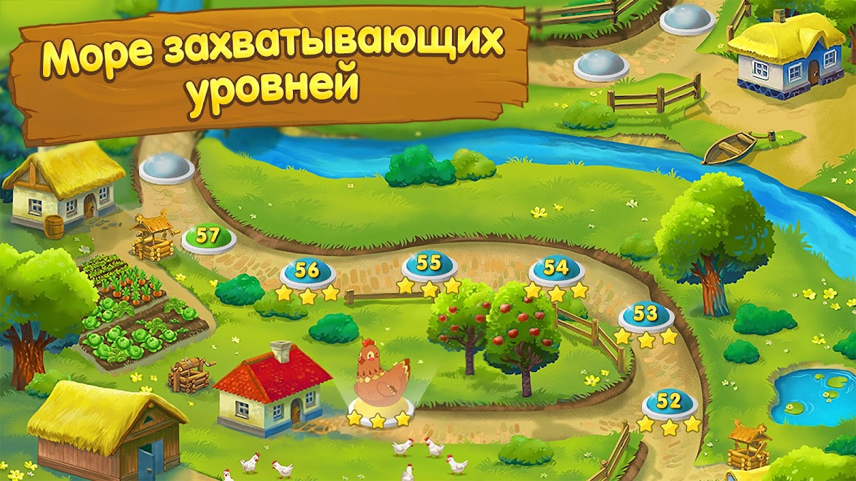 Наслаждайтесь классическим тайм-менеджмент геймплеем. Для того, чтобы покормить животных или собрать продукты достаточно просто нажать на экран! Попробуйте нашу весёлую ферму!