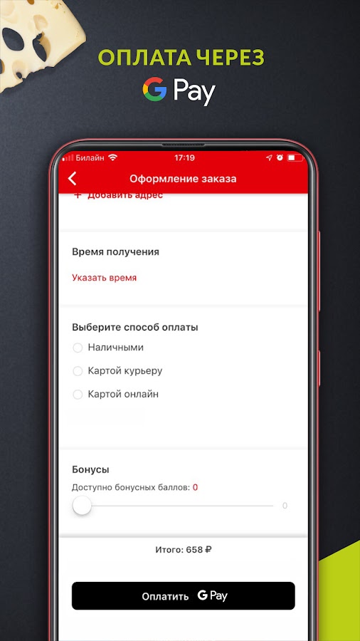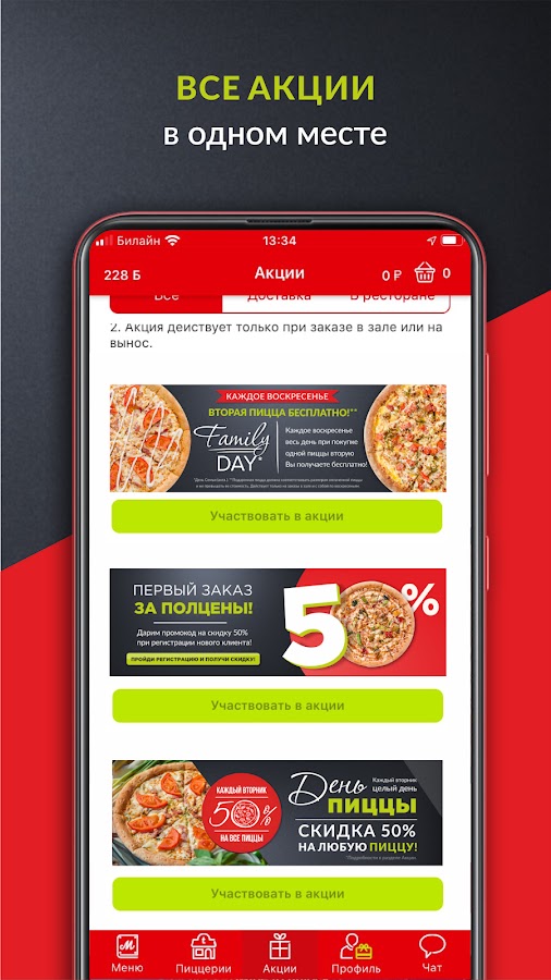 Мы дарим скидку 50% на первый заказ через приложение, бесплатную пиццу за скачивание приложения, множество подарков на день рождения. У нас проходят многочисленные акции: каждый вторник «День пиццы» — 50% на всю пиццу, каждую среду – 30% на доставку, каждый четверг – индивидуальная скидка до 40%, каждое воскресенье – вторая пицца бесплатно, а еще множество других выгодных акций, с которыми можно ознакомиться в приложении.