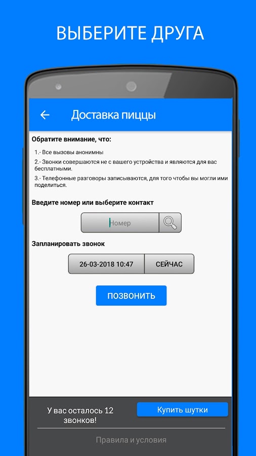Звонок выполняется не с вашего номера, а через наши системы, поэтому вы не платите за время, а ваши друзья не знают, что это вы их разыгрываете. Всего через 2 минуты вы сможете прослушать шутку в своем приложении или поделиться ею с остальными друзьями.