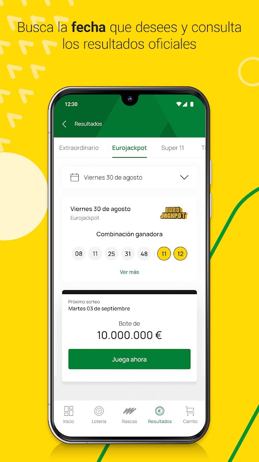 Загрузите приложение и покупайте комбинации Eurojackpot, Tríplex, Super 11 и Mi Día, ваши любимые номера купонов и наши скретч-билеты.