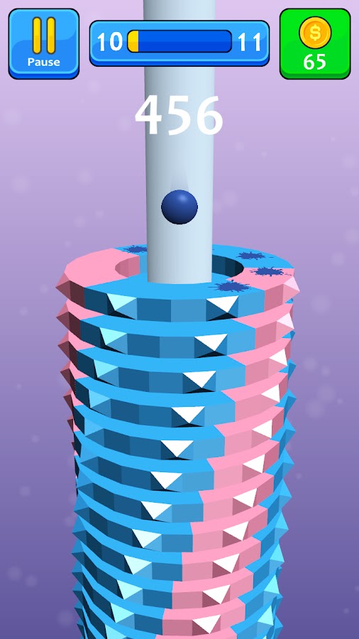 Цветной шар прыгает вниз по стек платформам и падает через лабиринт башни.