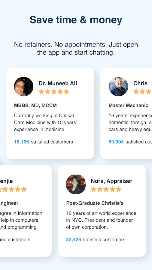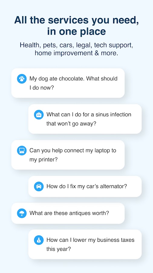 — Задавайте вопросы по более чем 700 профессиональным специальностям, включая юриспруденцию, медицину, уход за животными и многое другое.