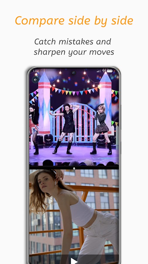 Разместите свое видео рядом с оригинальной хореографией, чтобы увидеть различия в тайминге, углах, линиях и энергетике.