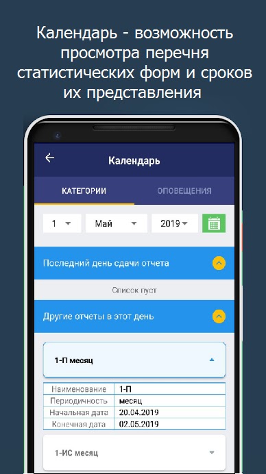Приложение позволяет просматривать информацию о статистических формах, необходимых к представлению в органы статистики, просматривать историю сдачи статистической отчетности, проверять задолженность, дает возможность получать персональные уведомления о наступлении и о заканчивающихся сроках сдачи отчетности.