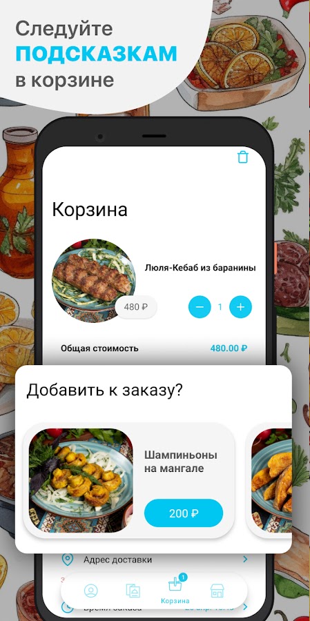 Как сделать заказ в приложении “Кафе Сим-Сим”: выберите понравившиеся позиции из меню, добавьте их в корзину и перейдите на экран оформления заказа (по нажатию на иконку корзины).