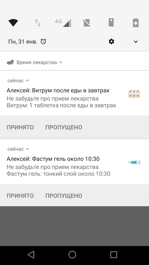 • Подробный журнал о пропущенных или принятых препаратах. После получения напоминания о лекарстве вы можете выбрать «Принято» или «Пропущено». Эта информация сохраняется в журнале и может быть просмотрена позже. Также вы можете позже прямо из приложения отметить лекарство как принятое или пропущенное.
