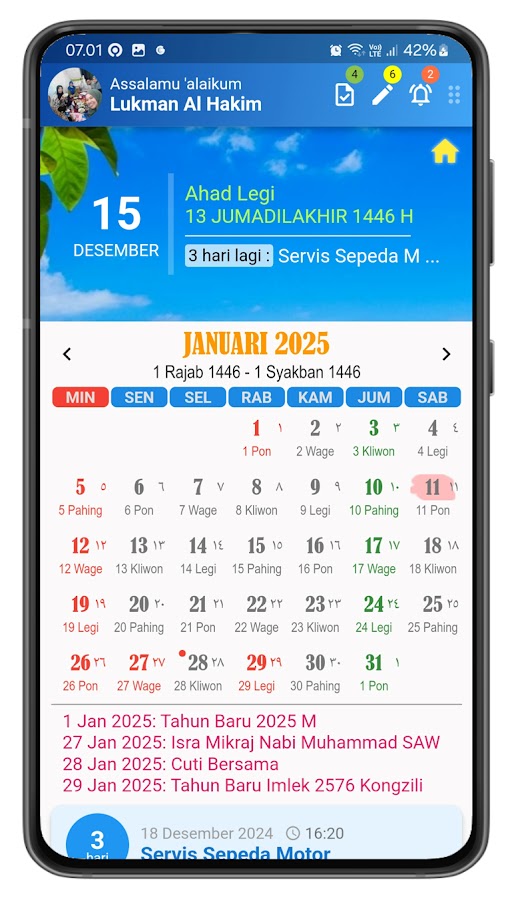 Ещё одна полезная функция Complete Indonesian Calendar — это ежедневная повестка дня. Она сделает ваше ежедневное расписание более организованным и лёгким для запоминания. Эту полезную функцию могут использовать учителя и люди других профессий.