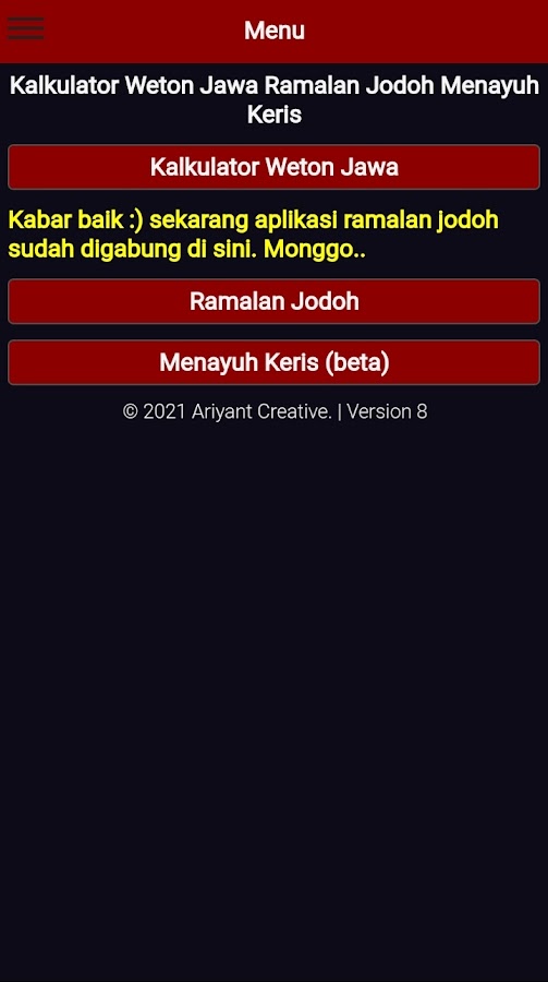 Скачайте приложение Kalkulator Weton Jawa Lengkap для Android бесплатно - последняя версия (25.0) уже доступна для установки на ваш телефон или планшет.