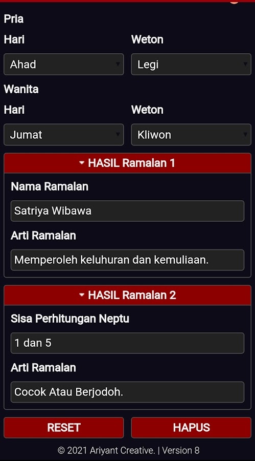 — Калькулятор свадебного хорошего дня/брачный контракт на основе яванского языка Weton