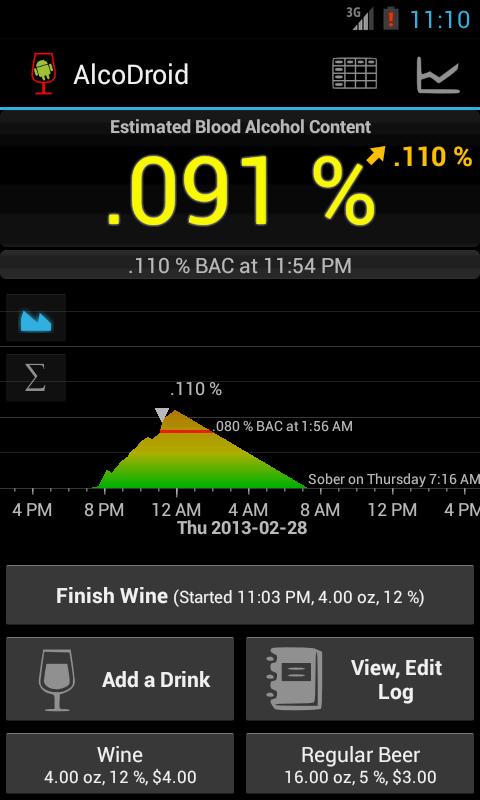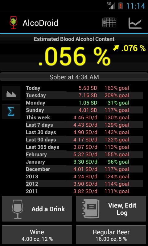 AlcoDroid также позволяет оценивать содержание алкоголя в крови на основе вводимых в журнал напитков, в наглядном графике отображает изменение уровня алкоголя и указывает, когда вы протрезвеете до определённого уровня.