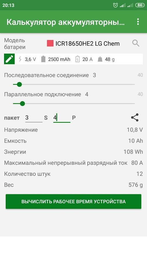 Вычисляет напряжение, мощность, массу и максимальный ток непрерывной разрядки аккумулятора (пакет), подключенный параллельно и последовательно.