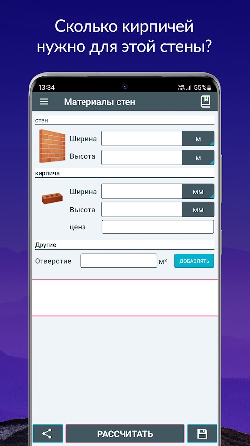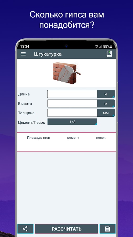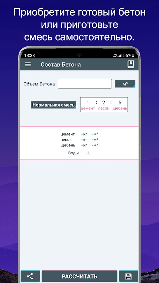 Бетон калькулятор — бесплатное приложение со следующими функциональными возможностями