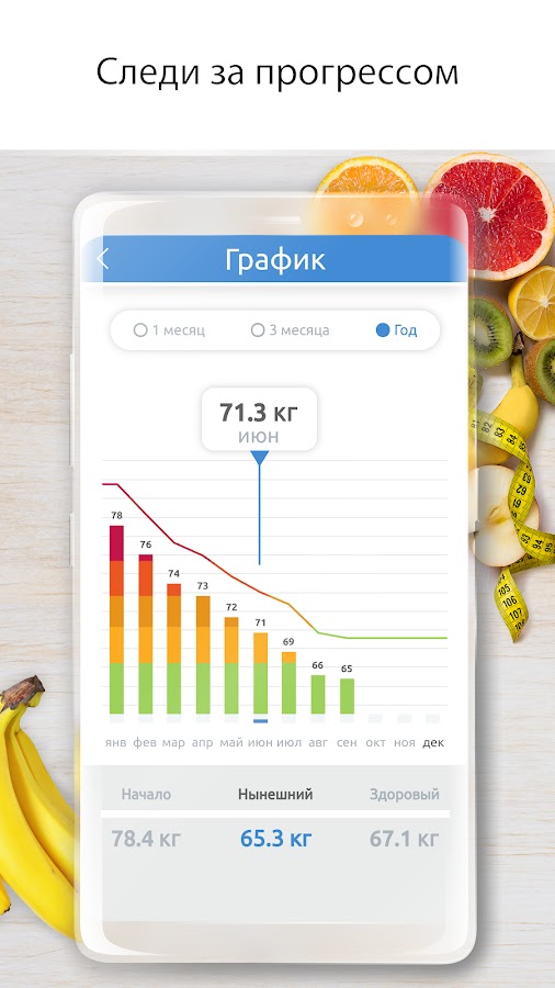 Наши графики покажут тебе именно то, что ты хочешь знать, за считанные секунды. Ежемесячный график поможет тебе увидеть эффект выбранной диеты отношении твоего веса; в то время как графики за 3 месяца и за год дают возможность мониторить и следить за прогрессом. «Идеальный вес» — это простой и быстрый способ достигнуть цели по похудению, поэтому ты можешь контролировать свой вес быстрее и без стресса.