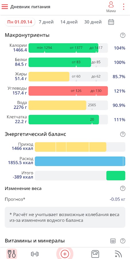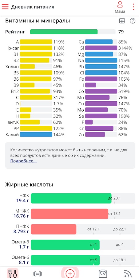 Баланс натрия и калия, источники нутриентов, рейтинг продуктов в рационе и другие отчёты.