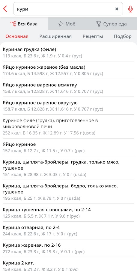 Проверенная база продуктов из более чем 7000 наименований с полным химическим составом (калорийность, бжу, витамины, минералы, жирные кислоты и другие нутриенты)