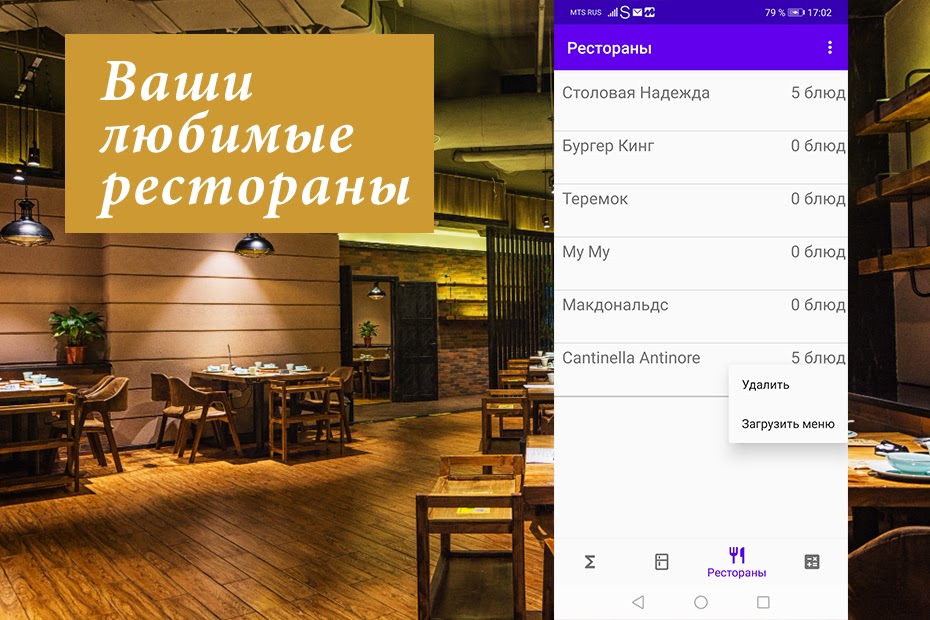Другой альтернативный вариант заполнения списка для расчета стоимости — перейдите на вкладку Рестораны и по долгому нажатию на выбранный ресторан выберите Загрузить меню.