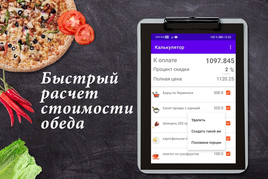Приложение рассчитает итоговую стоимость вашего обеда.