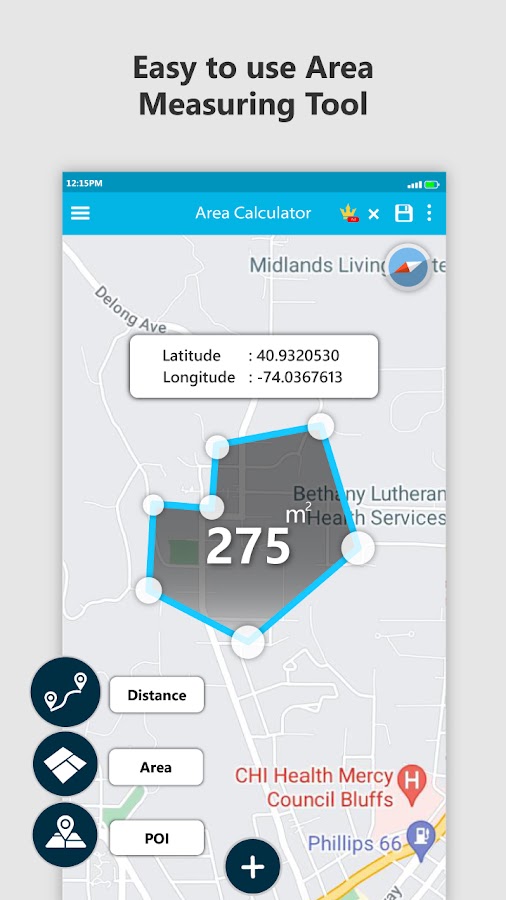 Это приложение для измерения расстояния по площади имеет калькулятор конвертера единиц площади и калькулятор площади и объема для расчета площади и периметра на карте вида области. Алгоритм приложения для оценки площади использует координаты GPS для измерения площади земли на карте местоположения области. Легко конвертируйте единицы площади в небольшие площади с помощью калькулятора площади в квадратных футах и функции калькулятора площади треугольника. Просто выберите точки области в приложении измерения площади, чтобы получить информацию о площади, отображаемую на экране.