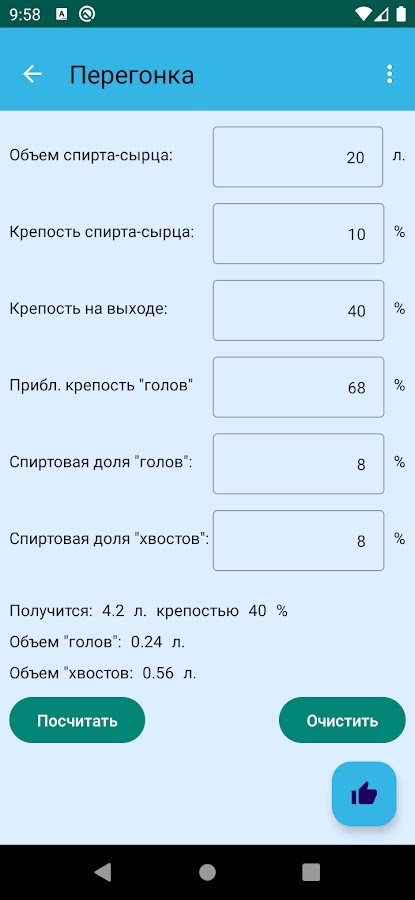 Простой калькулятор самогонщика поможет при разбавлении, смешивании и дробной перегонке. Занимает очень мало места, простой и понятный интерфейс. Поможет вычислить нужный объем жидкости.