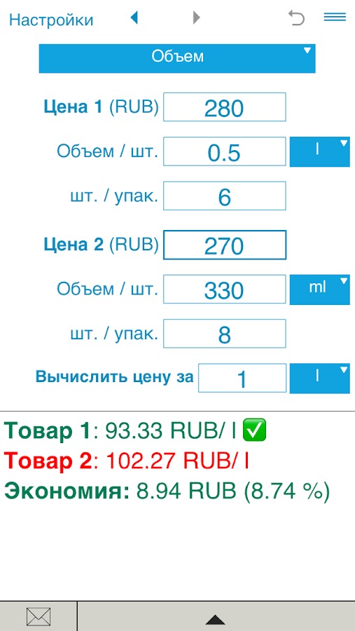 Просто введите цену и количество, вес или объем сравниваемых товаров и нажмите Вычислить.