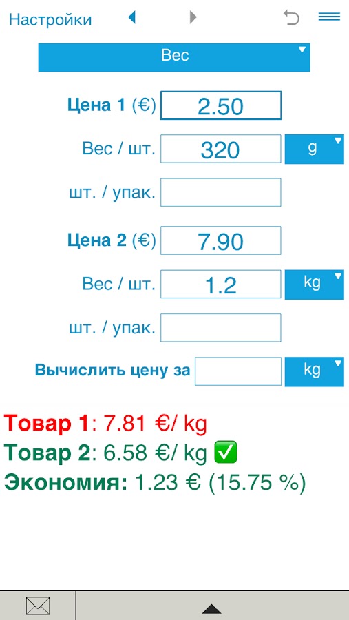 Приложение вычисляет цену за любое количество килограммов, граммов, литров, и т.д. Например, вы можете рассчитать цену за 100 r, 1 кг, 5 литров и т.д.