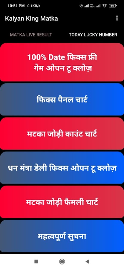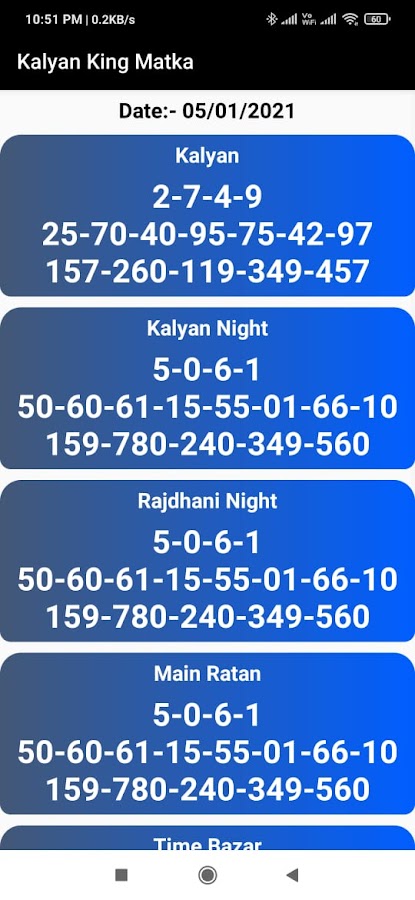Здесь живое обновление результатов прямо из офиса kalyan Matka для Kalyan и других игр с их маркета. С помощью этого приложения с диаграммой калян мы публикуем практически все известные игры, связанные с матка базаром.