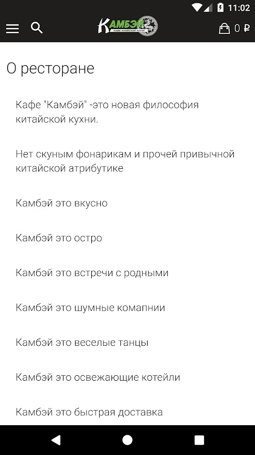 Приложение ресторана «Камбэй» позволяет оформить доставку заказа домой или в офис. С помощью данного приложения можно оформить заказ в 3 клика. Сохранить личную информацию, чтобы в дальнейшем не тратить время на повторный ее ввод в бланк заказа. Добавляйте любимые блюла в избранное и следите за историей своих заказов!