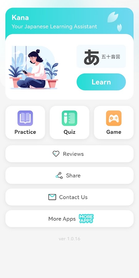 Приложение Kana предназначено для начинающих изучать японский язык. Оно помогает начинающим японцам быстро освоить произношение и написание катаканы и хираганы, а также заложить основу для дальнейшего изучения японского языка.