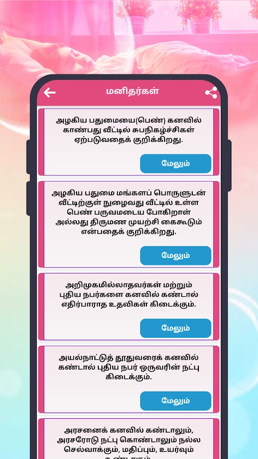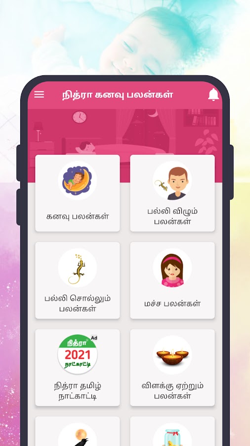 Кроме того, это приложение «Значение снов» состоит из Палли Вилум Палангал, Палли Соллум Палангал, Маха Палангал, Вилаку Йетрум Палангал, Кагам Караиум Палангал, Дхаана Палангал и Манайяди Шастра Палангал.