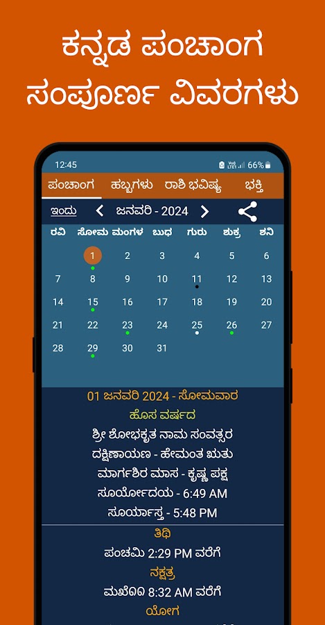 Скачайте приложение Kannada Calendar 2026: ಪಂಚಾಂಗ для Android бесплатно - последняя версия (4.5) уже доступна для установки на ваш телефон или планшет.