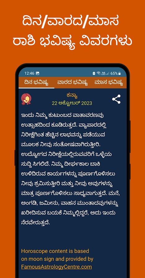 Подробности каннада Раши Бхавишья основаны на знаке Луны и предоставлены сайтом FamousAstrologyCentre.com. Подробности прогнозов для всех 12 знаков зодиака показаны в разделе Раши Бхавишья.