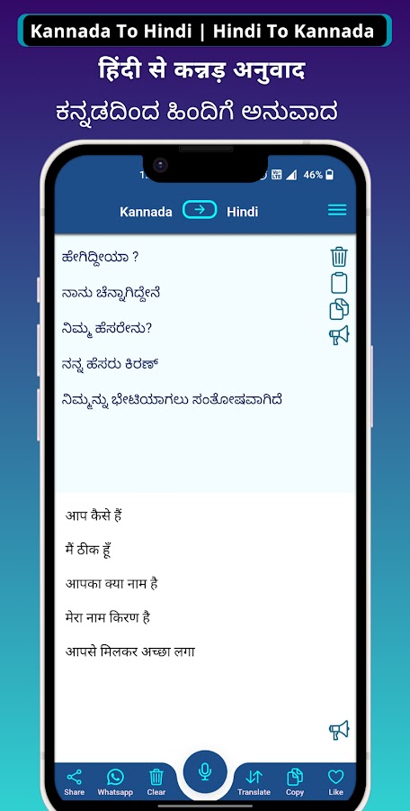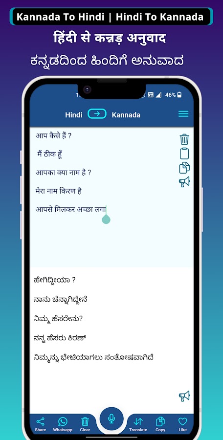 ПЕРЕВОД С ХИНДИ НА КАНАДА: приложение также поддерживает обратный перевод, что позволяет легко конвертировать текст с хинди в каннада. Эта функция идеально подходит для двуязычных пользователей или тех, кто хочет улучшить свои языковые навыки.