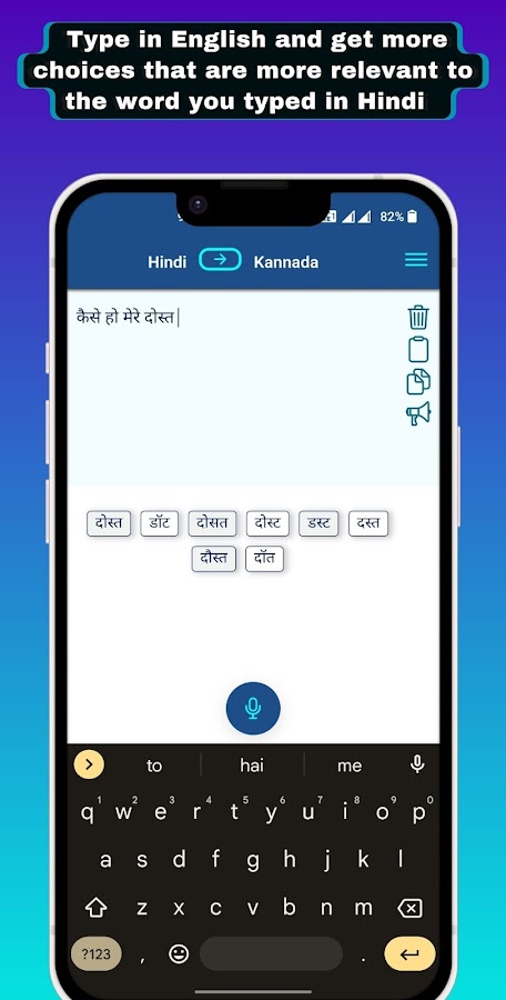 Используя кнопку переключения вверху, вы также можете печатать на хинди. Это делает ввод текста на хинди естественным. Когда вы вводите символ каннада, он автоматически переводится на алфавиты хинди. Когда вы нажмете пробел, в нижней части экрана появятся дополнительные слова, содержащие дополнительные варианты, соответствующие только что набранному вами слову. Вы можете печатать на хинди, используя буквы каннада, так, как вы на них говорите. Когда вы закончите печатать на хинди, вы можете использовать кнопку перевода внизу, чтобы перевести тексты с хинди на каннада.